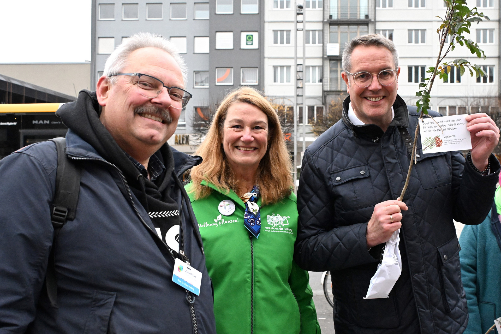 Die Vorsitzenden des Zukunftsrats, Prof. Dr. Nadine Kammerlander und Prof. Dr. Klaus Helling, hoben hervor: „Demokratie und Nachhaltigkeit sind zwei Seiten derselben Medaille. Nachhaltige Entwicklung erfordert Dialog, Vielfalt und Beteiligung – genau das, was demokratische Prozesse ausmacht. Mit dieser Aktion wollen wir sichtbar machen, dass wir beides gemeinsam stärken müssen. Demokratie und Nachhaltigkeit brauchen Räume, in denen Menschen Verantwortung übernehmen und Zukunft gestalten können. Jede Pflanze, die heute überreicht wurde, steht sinnbildlich für dieses Engagement.“